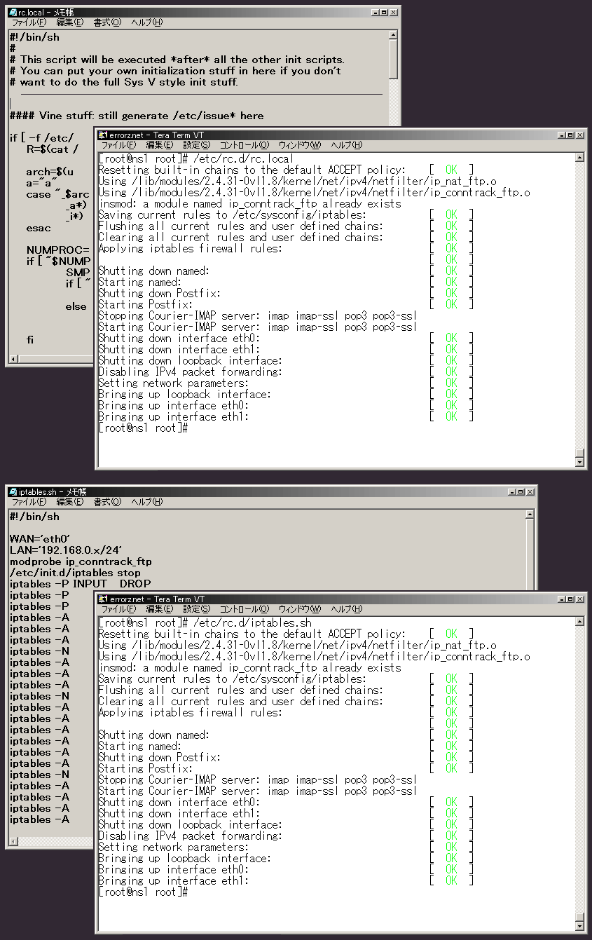 グッチャグチャ、と考えるのは 頭が固着か?。 大体、iptables.sh が エラー連発、 cannot execute binary file. 開かない。