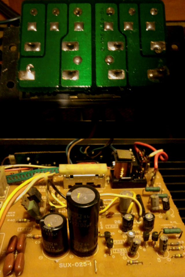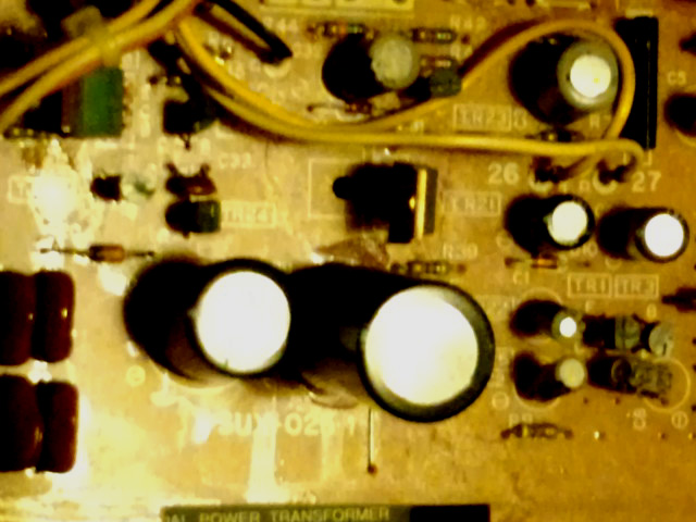 ヒューズも切れないし良く見りゃ電解液 が漏れてる コレだろと 35v 2200μF の変更も全く変わらんゎ