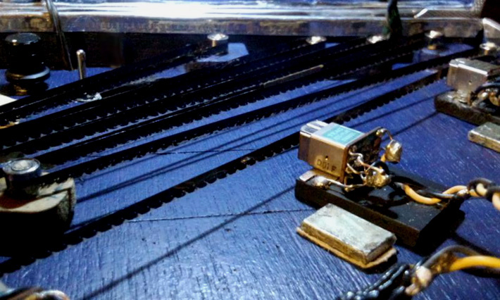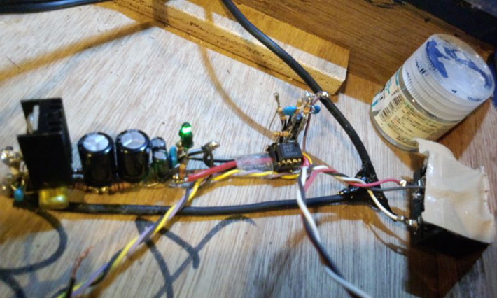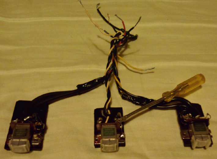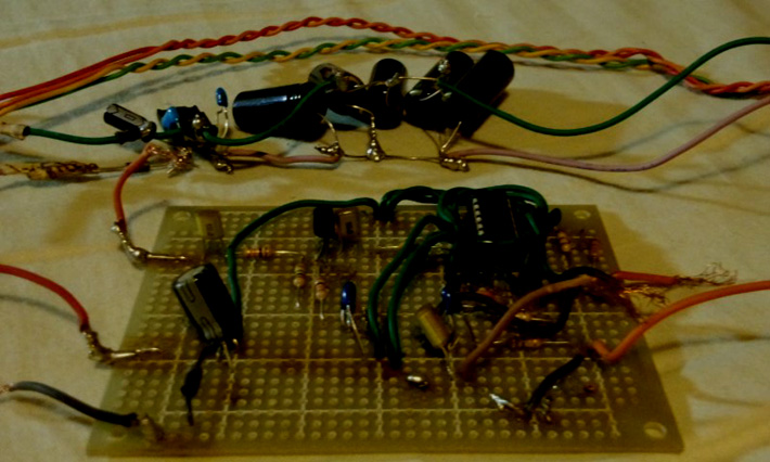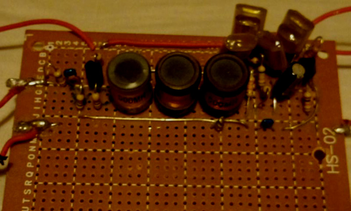 極細リードと延長 9v電源、シールド無しの 3連コイルの結果はノイズだらけであり、強力両電源増幅が