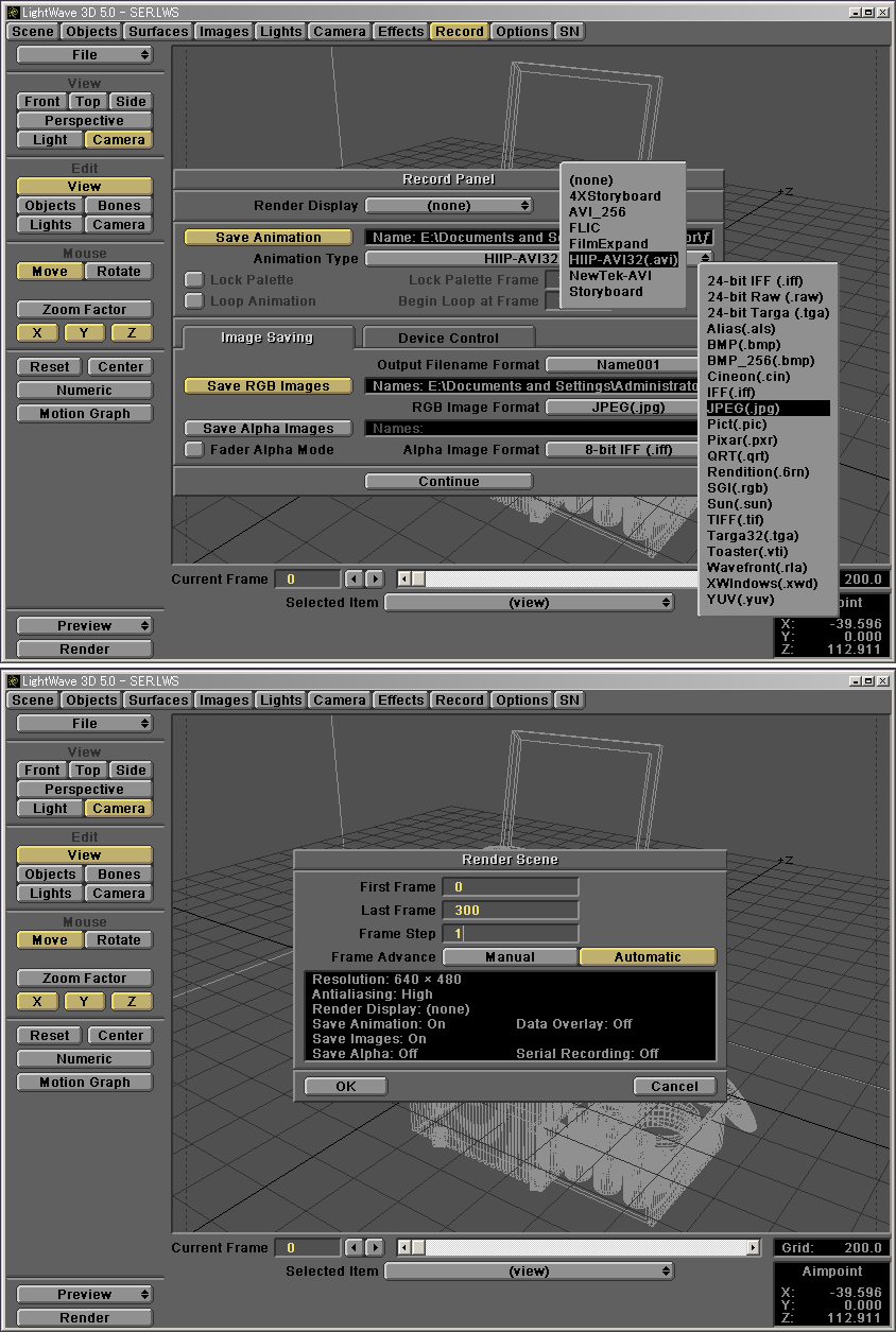 Lightwave 3D V 5.0 の アニメーションレコード の タイプ には、AVI_256、HIIP_AVI 32、NEWTEK_AVI などが有る。