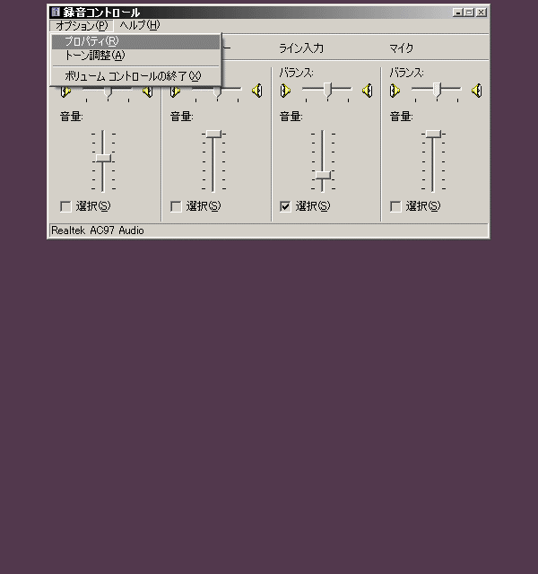 プロパティ だったのか、ステレオミキサーの WAVE と ライン入力混合録音もできるんがの、レベルが高過ぎ